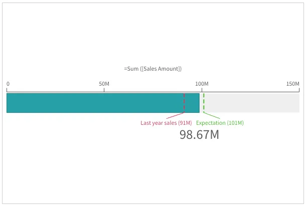 "refLine": { "refLines": [ { "show": true, // default "label": "Last year sales", "showLabel": true, // default "refLineExpr": { "value": 91000000, "label": "91000000" }, "showValue": true, // default "paletteColor": { "color": "#cc3c5b" }, "style": { "lineThickness": 2, "lineType": "8 4" }, }, { "label": "Expectation", "refLineExpr": { "value": 101000000, "label": "101000000" }, "paletteColor": { "color": "#49bd2b" }, "style": { "lineThickness": 2, "lineType": "8 4" }, }, ],},